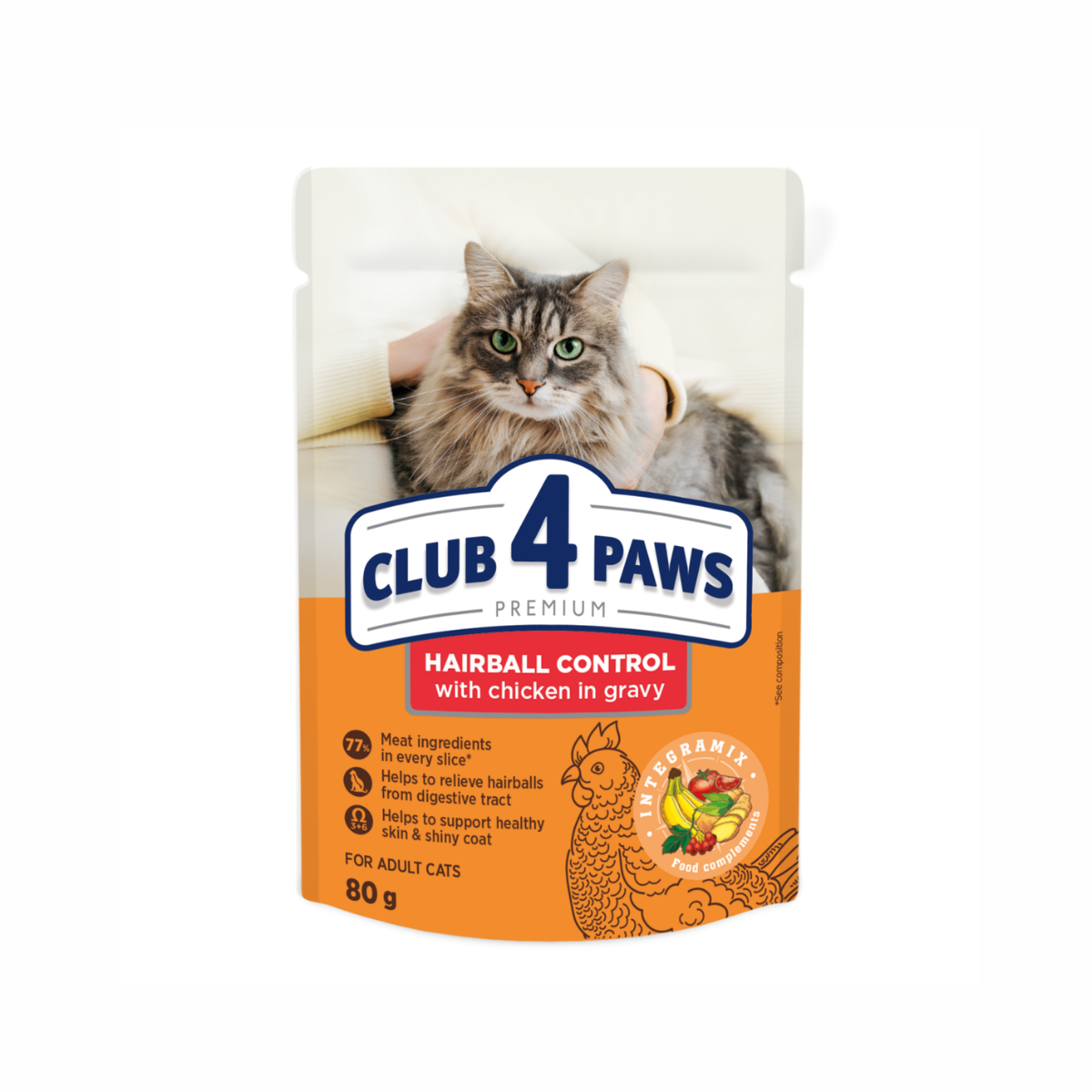 Hrana umeda completa special formulata pentru pisicile adulte predispuse la formarea ghemotoacelor de par. Reteta contine 77% carne si produse de origine animala in bucati, cu 46% pui, si un continut adaptat de fibre pentru a sprijini eliminarea naturala a parului ingerat.